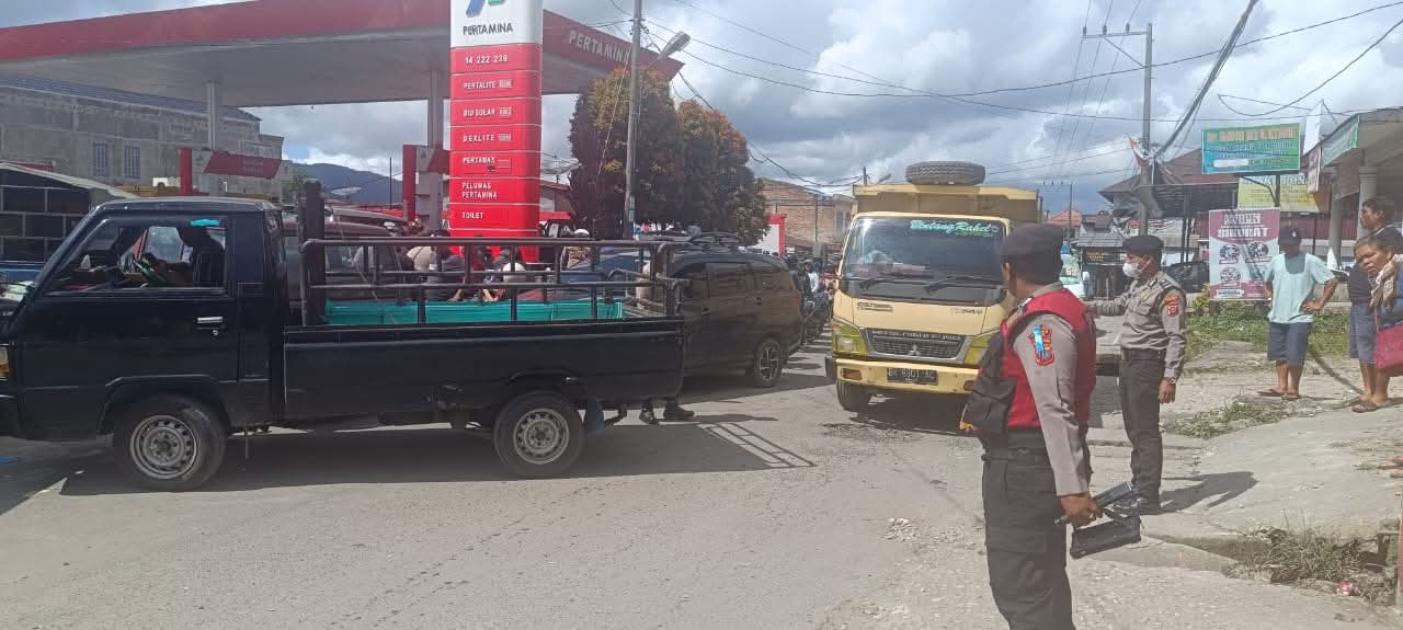 Teks foto : Polres Dairi Gelar Pengaturan Arus Lalu Lintas di Setiap SPBU untuk Cegah Kemacetan.(istimewa)